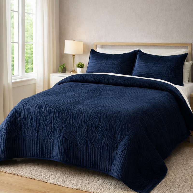 Velvety Quilted Bedcover Set with 2 Pillow Covers – Soft Premium Bedding- Blue
