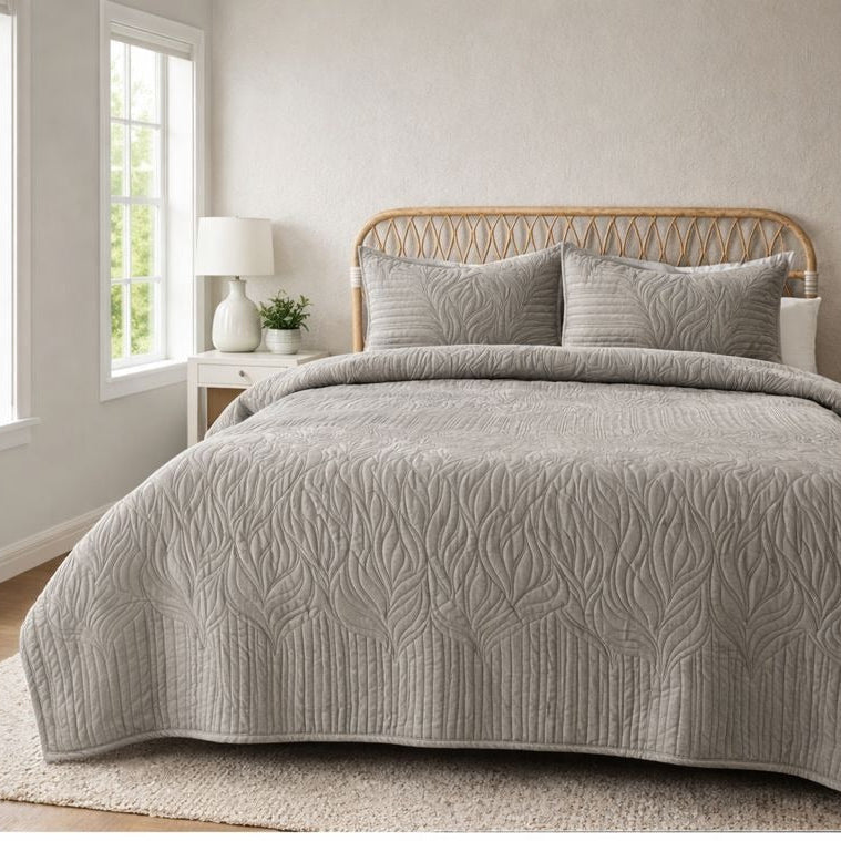 Velvety Quilted Bedcover Set with 2 Pillow Covers – Soft Premium Bedding- Grey